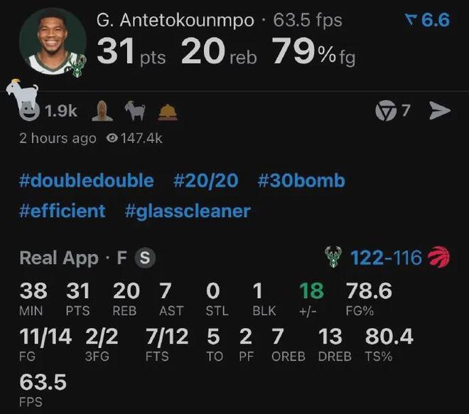 本賽季至今,字母哥出戰(zhàn)五場比賽,場均上陣32.6分鐘,狂轟34.2分13.4板7.2助1.2帽炸裂數(shù)據(jù),投籃命中率68.4%,場均以62.5%命中率扔進(jìn)1記三分球(8中5),在他帶領(lǐng)下雄鹿暫時(shí)以4勝2負(fù)排名東部第三。