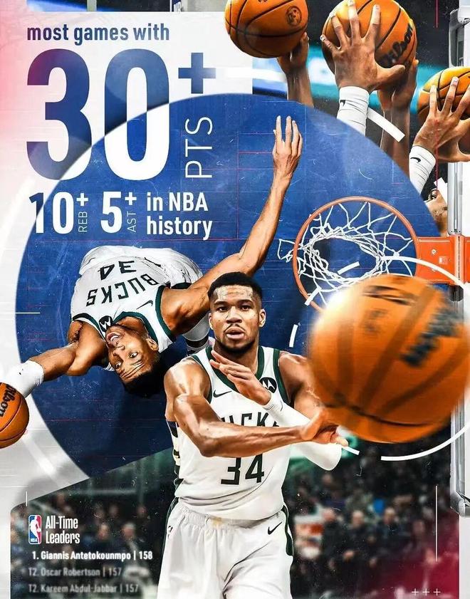 字母哥收獲30分10籃板5助攻,刷新紀錄